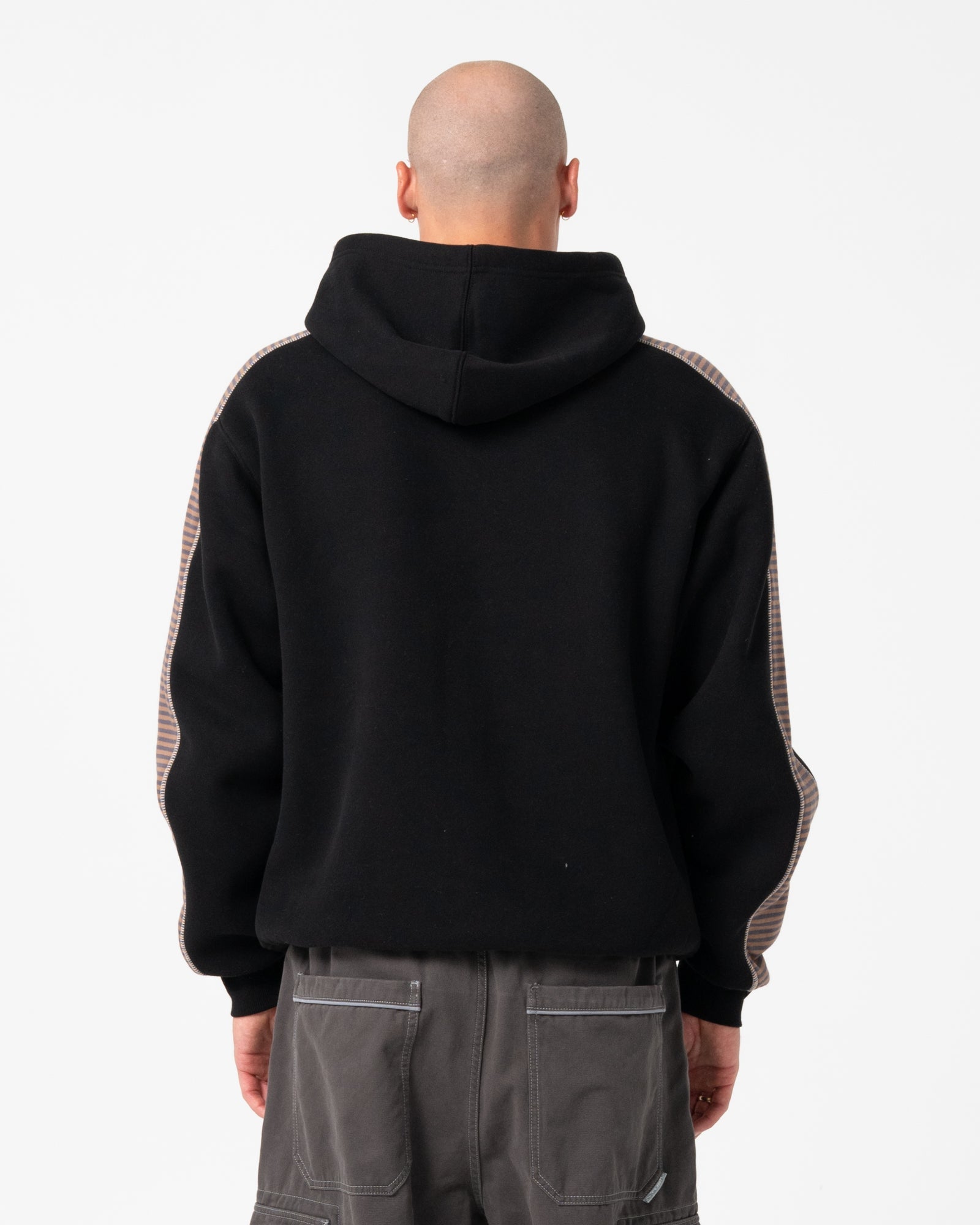 Relaxed R2K fit hooded fleece with striped panel and Rusty applique on chest.